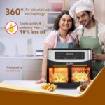 Great Product comes with 10 Preset cooking options-Preheat, French Fries, Drumsticks, Steak, Cake, Shrimp, Fish, Pizza, Vegetable, Dehydrate4.5L + 4.5L dual non stick independent frying basket with sync function. Cooks different food on different settings & finish at the same time. Cooks same food on same settings in same time2400 watts power adds to fast and healthy cooking.360° Hot air circulation technology. It quickly disperses heated air in all directions. It evenly cooks the food with 80% less oil compared to traditional fryers and preserves the crispy exterior texture