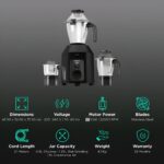 Durable Stainless Steel Jars with Handles – Comes with 3 jars: 1.6L Liquidizing Jar, 1.25L Wet Grinding Jar, and 0.6L Chutney Jar – all made of rust-free stainless steel with ergonomic handles for easy grip.