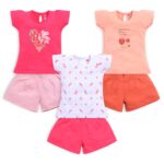 Made of 100% Cotton Knitted fabric makes it comfortable for the baby to wear. The attractive prints make the baby look more cuter. One pack consists of 3 sets of Half Sleeve Top and Shorts Set.